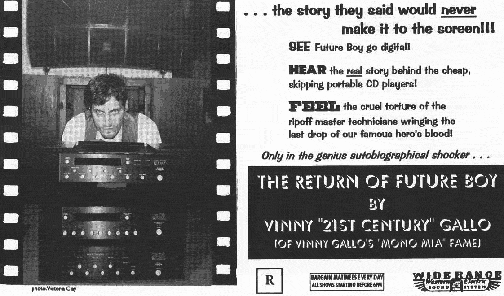 Sound Practices gets 8,000 fan letters a day praising my famous articles, 10,000 fanatic fan faxes addressed to me, and the office gets swamped with hundreds of phone calls from thrilled Gallo fans from around the world. And one time, one lousy time, the Gallo receives negative criticism, and boom! there it is in Print: Volume 2 #1 page 44, that's right! center page. Joe Roberts, you sneaky rat bastard. How could you do it to me, Joe, you half a man, you Judas? How could you print that piece of crap letter, you ungrateful spineless worm? And as far as being able to afford the damn Ongaku, don't make me laugh. I'm rich, you fool. Besides, the fans want the Gallo, the real thing, the one and only - ME. That's right, ME! Not all those pale imitations of me. They want Vinny G, Doctor Brown, Grandmaster Vincenzo, Kid Hi-Fi. Me, that’s right, me. The Gallo. So Ladies and Gentlemen, my faxing fans, MY praising pen pals and all my loving callers, the Gallo is back. Id like to first thank you for taking time out from one of those ridiculous waste of time amp columns to read my latest hi-fi poem. It’s about the life, death, and resurrection of Vinny 21st Century, Future Boy. Born Vincent Gallo in Buffalo, N.Y. in 1961. Grew up there poor with his mom and pops (immigrants from Sicily) during the 60s and 70s. His pops was very proud. His whole family lived on plain boiled macaroni but he insisted on driving a brand new Cadillac every year. He had to have it, always black with that white interior. Every time Future Boy sat in it, he got a beating for dirtying the seats and carpeting Pops, even though he's got three little kids, he's still gotta have a white interior. Future Boy loved going with his pops to the dealership to pick up the new car. In the 60s it felt like each year the new things got better and better, it was so exciting. Future Boy thought by the time he was 21 all disease would be curable, cars would fly and run on water and people would live forever and stay young looking. He'd fly the first spaceship to Pluto. He loved all the new modem things. He was a techno-loving guinny, Vinny 21st century, Dr. New. His friends called him FUTURE BOY. And that was me, I was future boy. But one dark day my daddy picked up his new Caddy and started complaining about it, things like “Ah I shoulda kept the old one, Goddamit! Look at this cheap thing." Then one week later he traded it back in for a new version of the last year's model. It was the last one on the lot and he had to take a gold with a black interior. He kept that car 10 years, and my half deaf, half blind grandpa drove it over my uncle Angelo's favorite lawn statue of St. Anthony of Padua, through his tomato plants and into the side of the Bunza's house next door. No one was hurt, but my pops' last great Caddy was gone. Forget the tomato plants and that beautiful statue. Pops' Caddy was killed and he would never love another one. He drove them, yes, but he never loved them. It feels horrible to be disenchanted with new things and the future. It's the tragedy of the 20th century. By the age of 18, "Future Boy" was dead. After that I started running around pumping old folks with the "what was it like back then' question. I've spent most of my adult life wishing, wishing it was still like that, wishing they still made those, wishing it was still there, wishing people still did that, wishing you could still buy them. Wondering why they stopped making them, wondering why they had to change. And it wasn't even a nostalgia trip, after all I hated Elvis and that whole 50's thing. But it just felt like all the great things had already happened. I became stuck, locked into an image of the past and cynical about the future. I began romanticizing things that were just normal for the people who experienced them. For instance, I love my 1951 blond D'Angelico New Yorker cutaway guitar, sounds great, it's incredible. It's super cool but a lot of tired businessmen now want it so they can pretend that they are a jazz legend. This guitar is now worth 75,000 dollars. Great jazz players can sound good on any guitar. They bought D’Angelicos in the 50's because at $300 it was a fine hand made working guitar they could use to make $75 a week playing in a band 7 nights. I would buy some old guy's old car and spend months and tons of money and aggravation trying to make it original, like new. I'd look up from under my car, grease on my face, the old bastard who sold it to me would be driving by in his brand new car, steering with a pair of clean hands. And laughing. And me thinking I was so smart and cool. Like an asshole I spent $30,000 rebuilding a 1967 Chevy 11 SS. The car is cool, no question. It's fast, good looking, but let's face it, it's just an old car. No air bag, no seatbelts, it’s loud, bumpy, bad on gas. I think the people who I drive past enjoy it more than me. They get to go, 'Wow, look at that neat or car," then go back to their happy lives, while I the asshole drive it back home to' start fixing it again. I was insane to sink $30,000 into it. The car is an emotional burden. A few months ago I drove the $22,000 brand new 1994 Chevy Impala SS It was cool, fast and good looking. And it was brand new. Nobody else's dirty fat ass rested on its brand new seats. I didn't have to leave it with the paint guy for 6 months, I didn't have to make 7,000 phone calls tracking down rare original parts. It was right there man, brand new with a warranty. And I loved it and I want it, and as soon as I can find another loser like me who'll give me some cash for my '67 I'm gonna run and buy the '94. I love new things again. And it feels great and I don't have to and haven't stopped loving great old classic products like my hi-fi gear or my old D’Angelico or my great old stove. But the '67 Chevy, that's got to go. Old cars are like an old pair of underwear. They stink. Although I would travel long and far and pay top dollar for an old pair of dirty panties 
